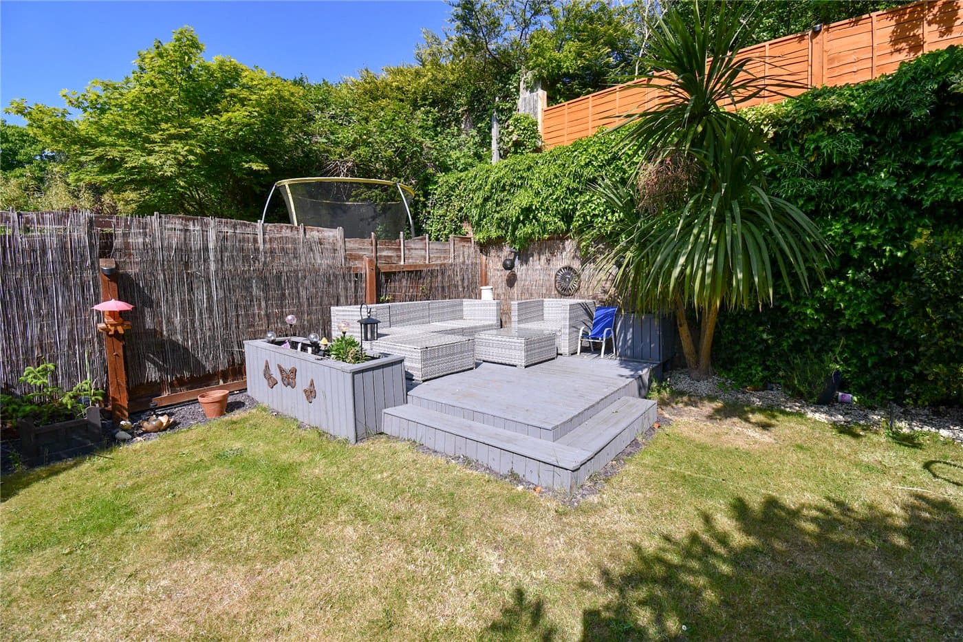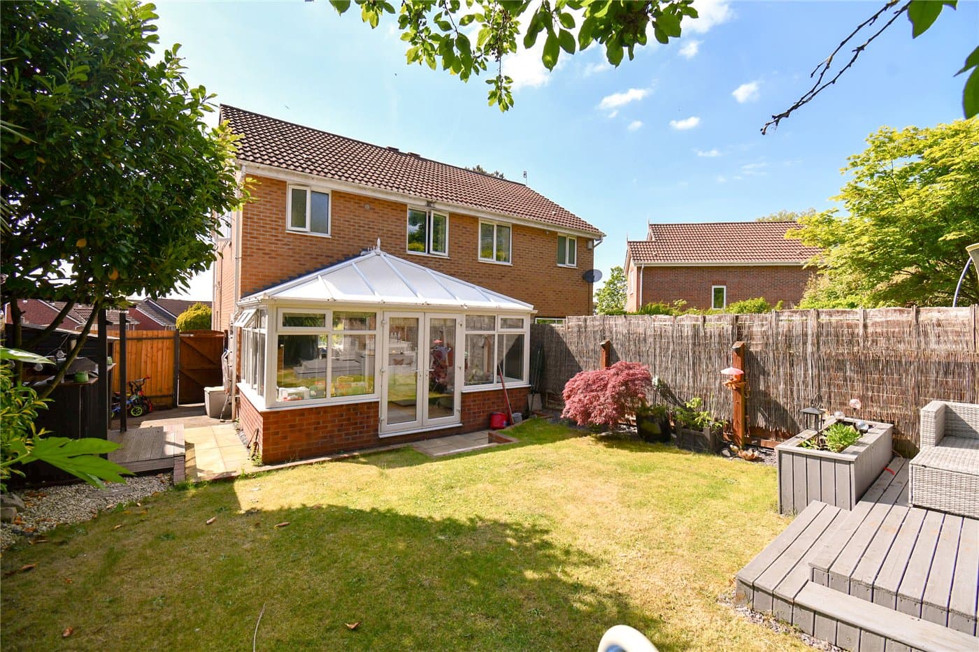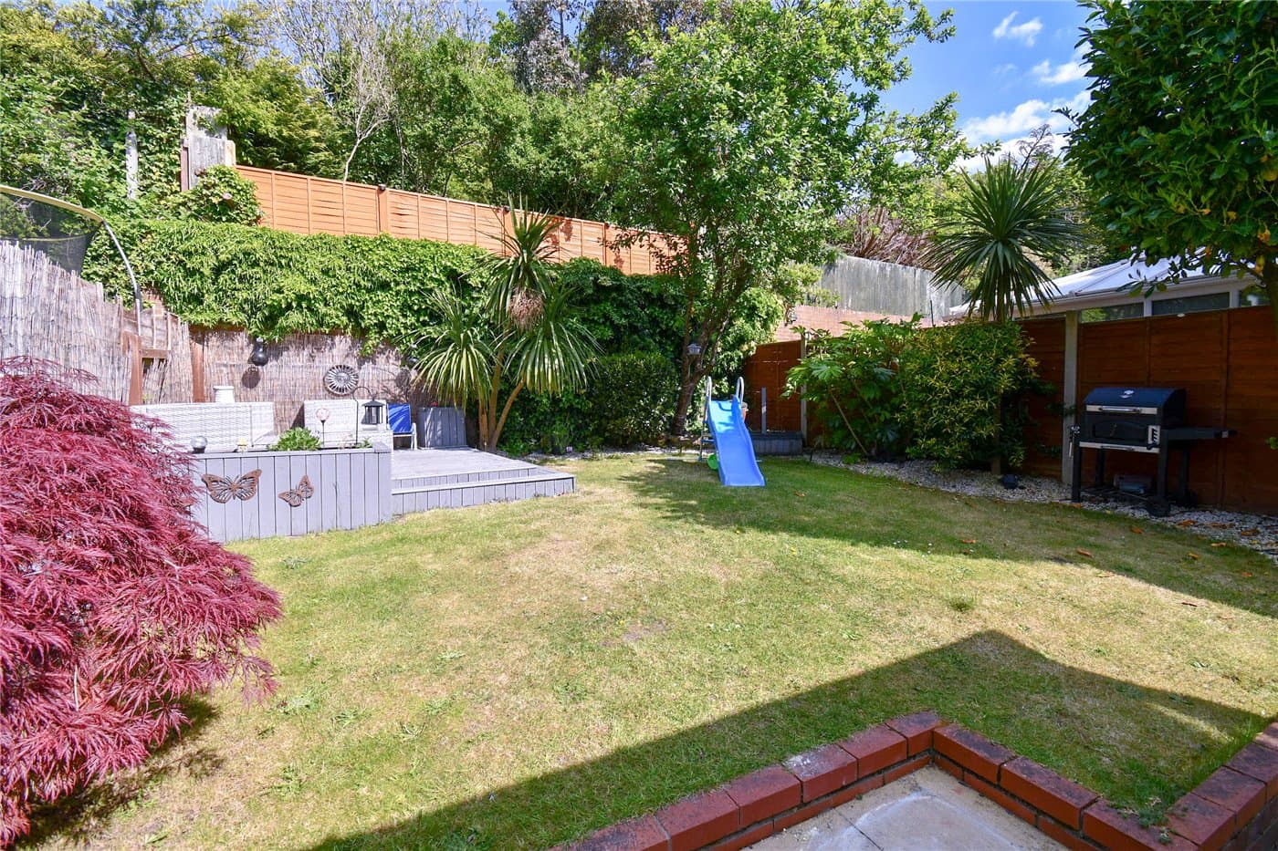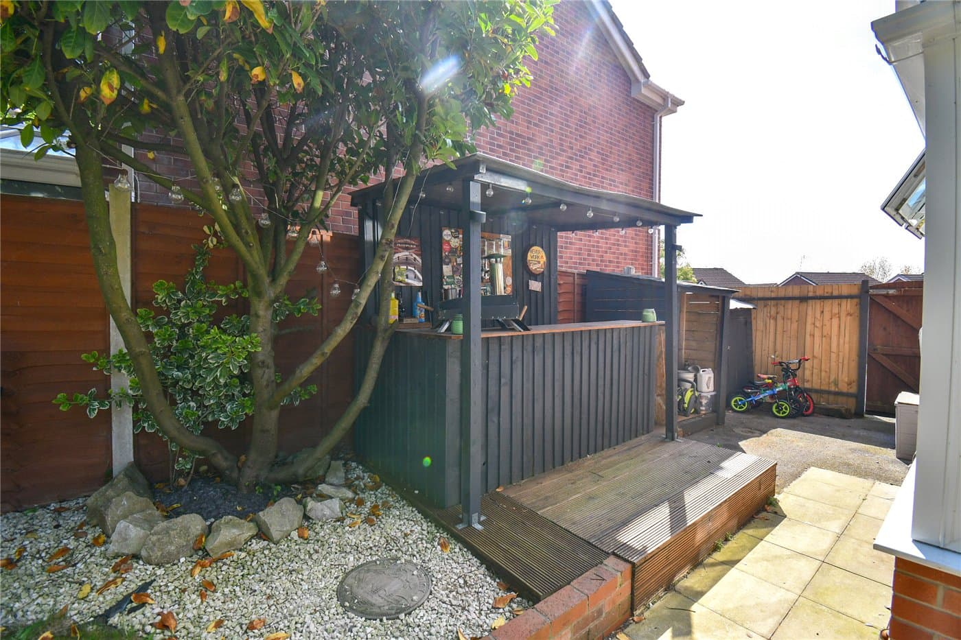 Generous rear garden with decked seating area & outdoor bar