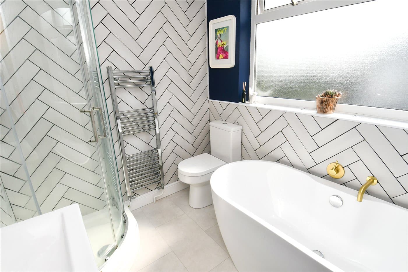 Stylish four-piece family bathroom with free-standing bath